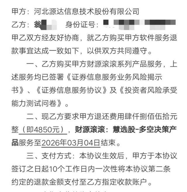 “交了钱就被踢出群,签了退款协议却迟迟拿不到钱,这哪是‘财源滚滚’,分明是‘财源空空’。”最近,翁先生提起在河北源达信息技术股份有限公司(下称“源达投顾”)的投顾服务经历时,满是无奈。