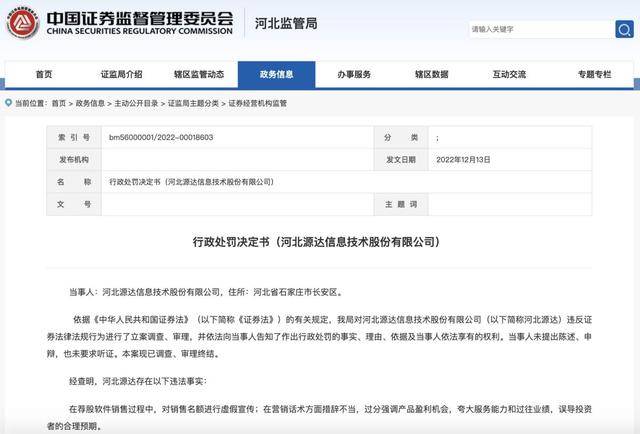 2022年12月,河北源达被河北证监局处以120万元的罚款。罚单指出,在荐股软件销售过程中,河北源达对销售名额进行虚假宣传;在营销话术方面措辞不当,过分强调产品盈利机会,夸大服务能力和过往业绩,误导投资者的合理预期。