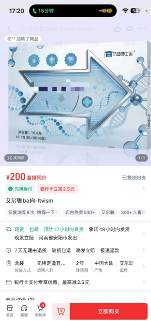 据网经社获悉,在直播中,主播宣称该产品由“200多位博士研发了3年”,具有“靶向抗癌”功效,能解决睡眠和身体不适问题,并暗示“不是有钱能买到的”。然而,消费者收到的产品仅为普通食品,其包装属性标注清晰,与药品无关。