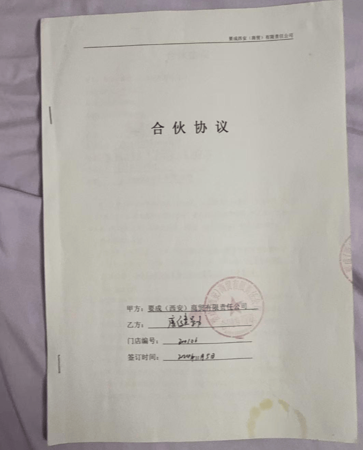 当月5日,唐健勋与要成(西安)商贸有限责任公司签订协议。根据唐健勋提供的这份《合伙协议》,甲方是要成公司,乙方是唐健勋,门店名称为“龙首商业街店”,合作期限为5年。协议第一条明确写道:“乙方自愿与甲方合作……由乙方开办‘折扣牛’店铺”“合伙店在经营期间应自主经营、自负盈亏,自担风险,独立承担债权债务”。