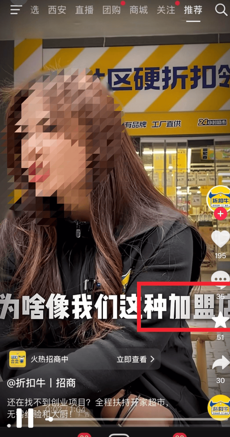 红星新闻记者在视频平台搜索有关“折扣牛”的广告发现,不仅视频中自我介绍“像我们这种加盟店”,广告也被标注“创业有风险,加盟需谨慎”,项目详情页面也为“一键获取加盟详情”。