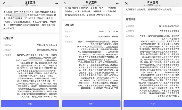 唐健勋提供的西安12345投诉热线记录显示,2025年3月,他举报“折扣牛”雁塔区裕昌太阳城店售卖的花生过期,经相关部门查证后属实,随后对商家“进行批评教育,规范经营行为”。未央区一家“折扣牛”门店也被查实销售过期食品,执法部门经现场核实发现情况属实,责令该店铺立即整改。莲湖区的另一家门店也被核查,市监部门现场核查后确认“商家承认曾经销售过期食品给投诉人”。