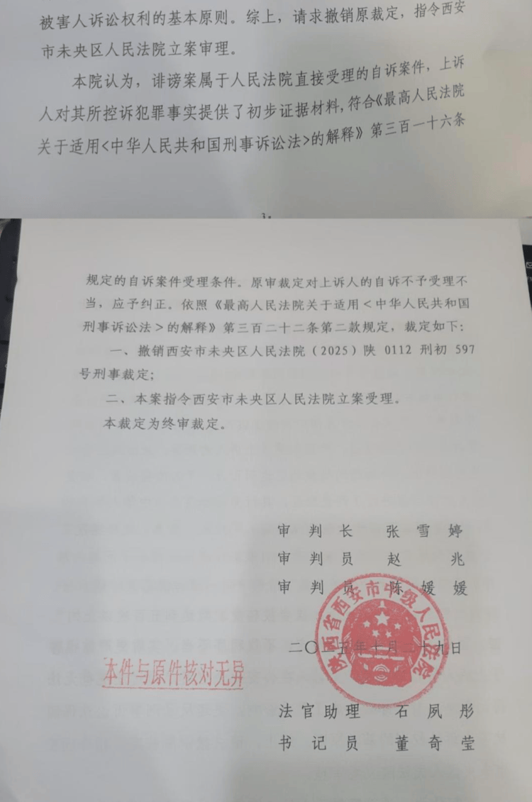2025年9月15日,未央区法院作出刑事裁定,认为唐健勋提交的证据“不足以证明被告马昕彤犯诽谤罪”,对自诉不予受理,唐健勋随即上诉。2025年10月29日,西安中院作出二审刑事裁定,撤销未央区法院的一审裁定,指令未央区法院立案受理。