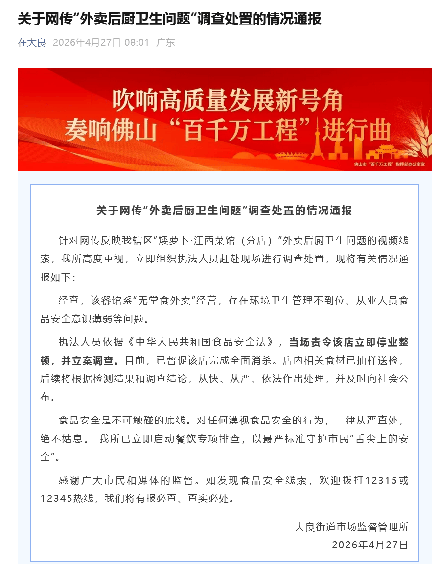4月27日,广东佛山市顺德区大良街道市场监督管理所发布关于网传“外卖后厨卫生问题”调查处置的情况通报。