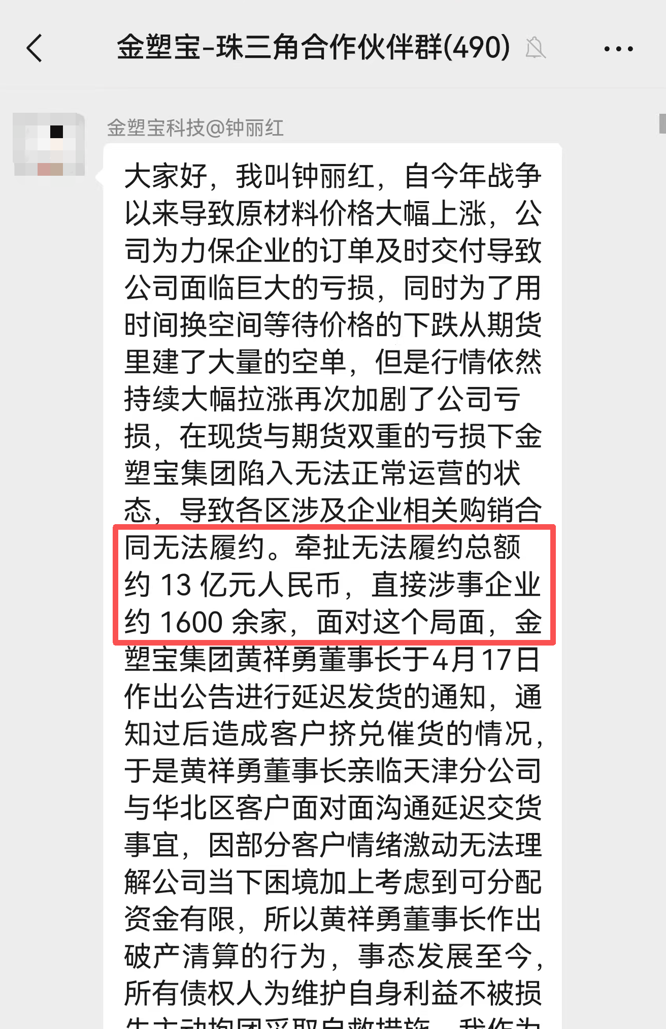 钟丽红还称,在现货与期货的双重亏损下,金塑宝陷入无法正常运营的状态,导致相关购销合同无法履约,牵扯到无法履约总额约13亿元人民币,直接涉事企业约1600余家。“因涉及的群体与参与方多而复杂,目前形成初步方案,当前部分代表正在积极沟通交流之中。”