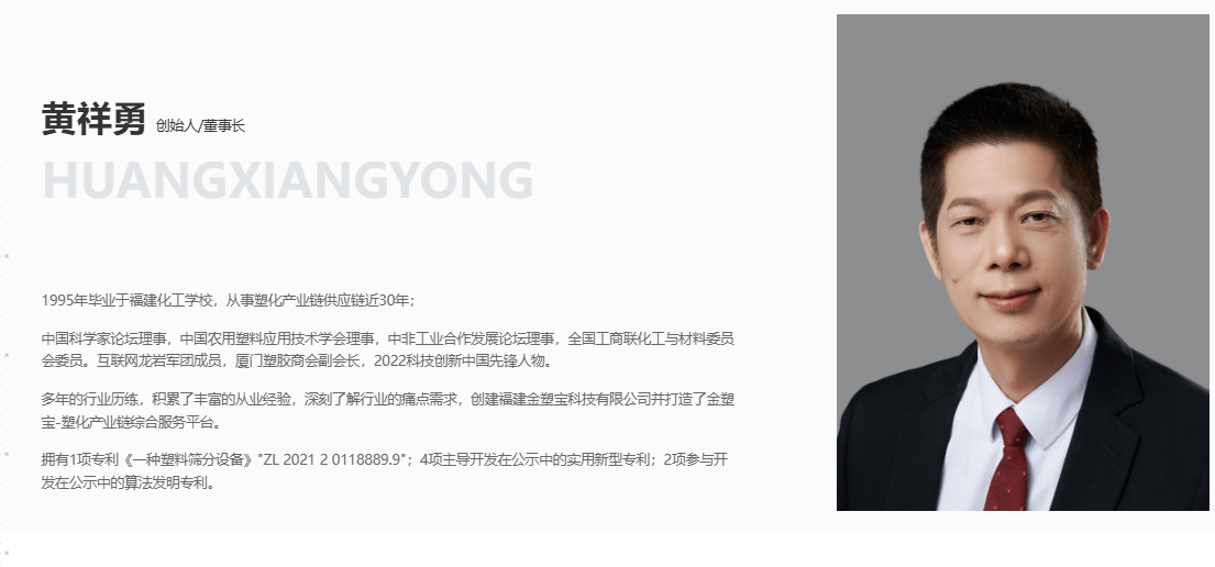 公开资料显示,金塑宝成立于2020年,是塑化产业链综合服务平台,其主体运营公司为福建金塑宝科技有限公司。用户可通过金塑宝APP购买聚乙烯、聚丙烯等产品。根据天眼查APP,股权穿透后,黄祥勇为金塑宝持股100%的实控人。