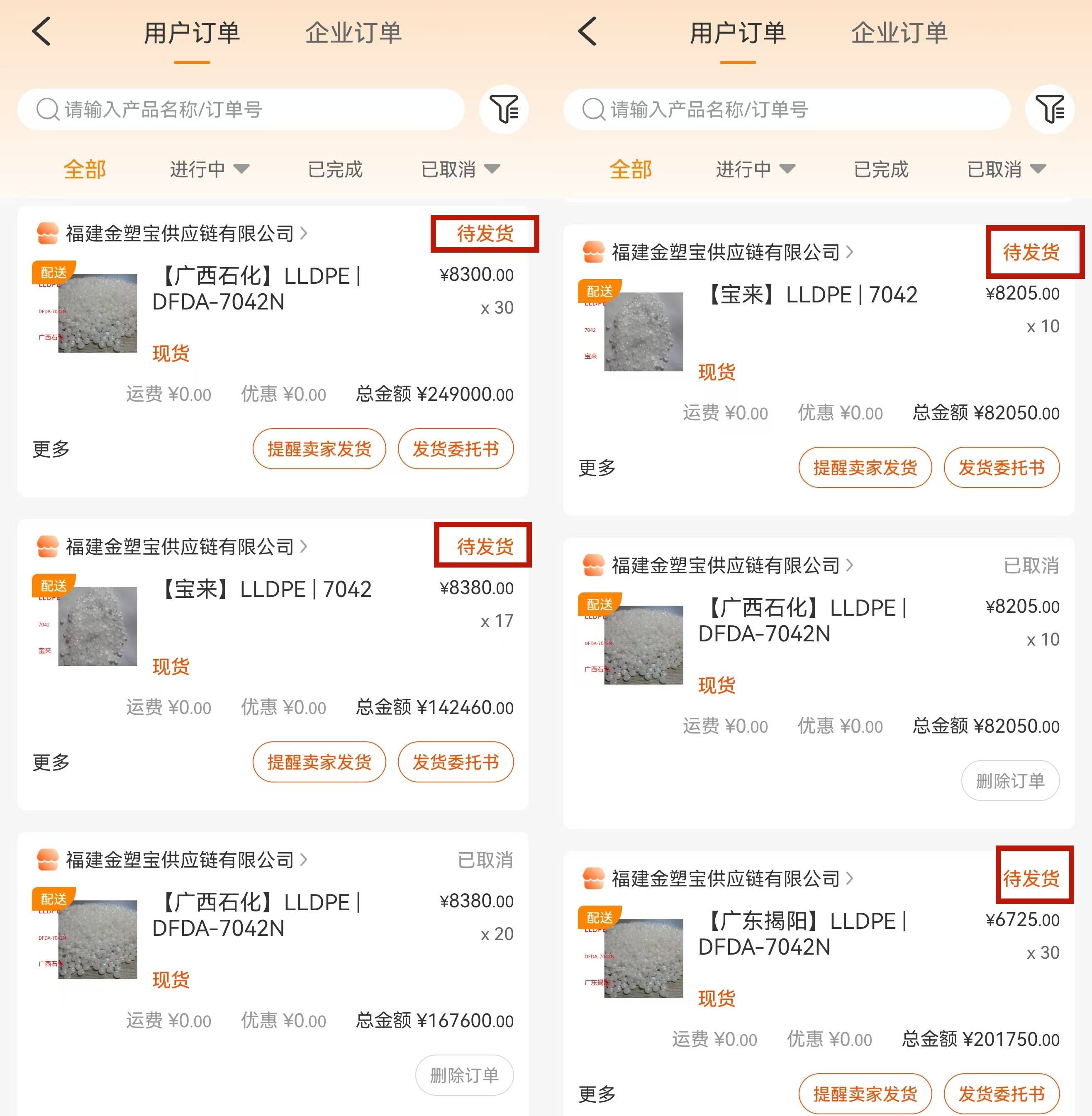 订单截图显示,杨先生在金塑宝平台下单了多笔聚乙烯订单,单价在6725元/吨到8380元/吨不等,现在的状态均为“待发货”。