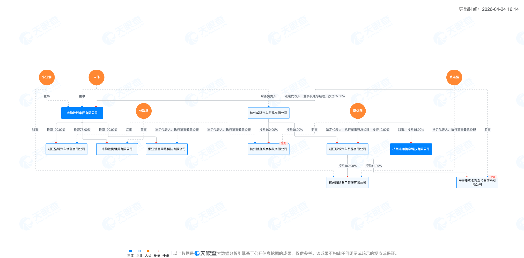 为了规避前端主体的风险,“浩韵系”设置了专门的平台隔离层——“车极星”平台,其运营主体为杭州浩渤信息科技有限公司。小编核查天眼查,浩韵控股集团有限公司的实际控制人钱浩强(法定代表人、董事长兼总经理,持股55%),与杭州浩渤信息科技有限公司的法定代表人张乃劲、以及陈煜阳(在浩韵系相关公司中担任关键职务)之间存在密切的交叉任职关系。通过钱浩强、张乃劲、陈煜阳等核心人物的人员重叠与业务协同,浩韵控股集团与杭州浩渤信息科技有限公司形成了强关联。杭州浩渤信息科技的核心作用,是切割与失信主体浩韵控股的关联,以正规科技平台的形象对接持牌金融机构,为后续资金合作铺路。
