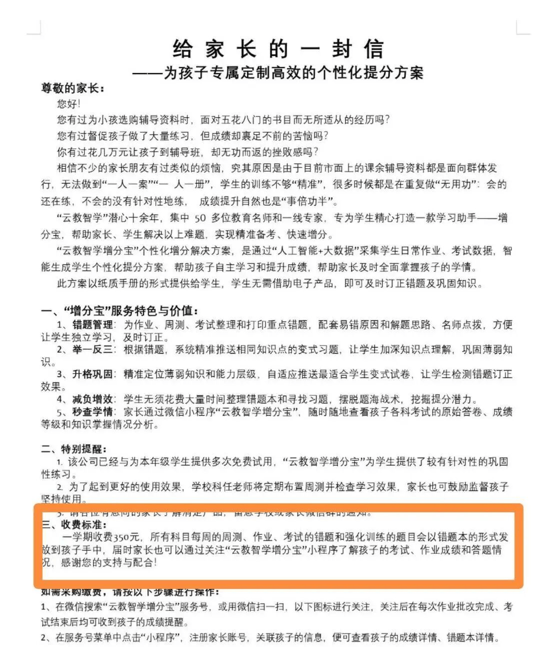 信中强调,该公司已经给本年级学生提供多次免费试用,家长通过“云教智学增分宝”可随时随地查看孩子各科考试的原始答卷、成绩等级和知识掌握情况分析。学校科任老师也将定期布置周测并检查学习效果,家长也可鼓励监督孩子坚持使用。记者注意到,信中注明了使用该学习助手一学期收费350元。