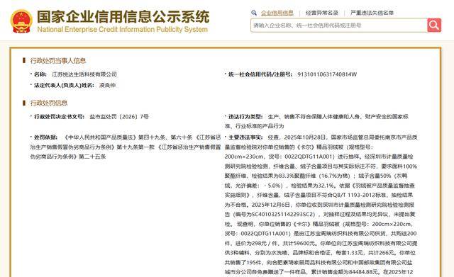 行政处罚信息显示,2025年10月28日,国家市场监管总局委托南京市产品质量监督检验院对江苏悦达生活科技有限公司销售的《卡尔》精品羽绒被进行抽样。经深圳市计量质量检测研究院检验检测,纤维含量、绒子含量项目与其实际标注不符,要求面料100%聚酯纤维,检验结果为83.3%聚酯纤维(16.7%为棉);绒子含量50%(允许偏差:﹣5.0%),检验结果为32.1%。依据《羽绒被产品质量监督抽查实施细则》,纤维含量、绒子含量项目不符合QB/T1193-2012标准,抽检结果为不合格。江苏悦达生活科技有限公司销售的《卡尔》精品羽绒被是由江苏宝阁瑞纺织科技有限公司供货,共购进200件,进价为298元/件,共计59600元。