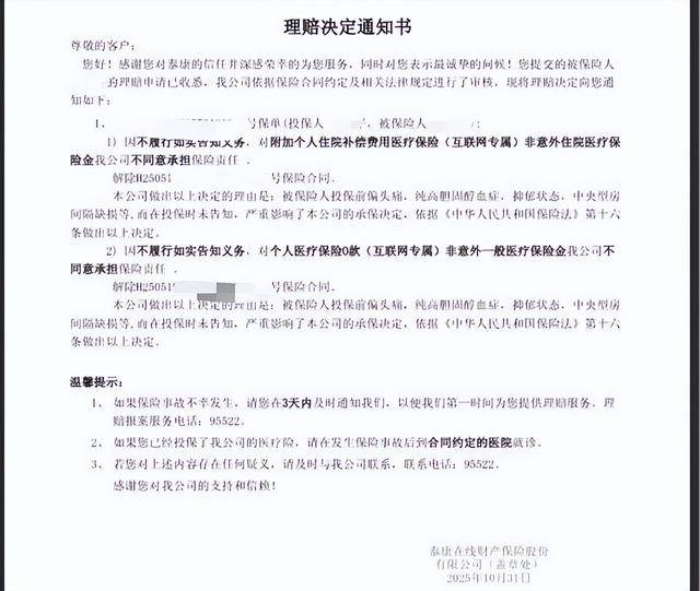 而泰康在线公司给出的答复与业务员说法不同。用石女士的手机打开该公司的“微信小程序”,“我的保单”一栏下面显示为零,理赔记录中有一份日期为2025年10月31日的理赔决定通知书。该通知书显示,“因(石女士)不履行如实告知义务,对附加个人住院补偿费用医疗保险(互联网专属)非意外住院医疗保险金我公司不同意承担保险责任。解除H250519143383570191851号保险合同。理由是被保险人投保前偏头痛、纯高胆固醇血症、抑郁状态、中央型房间隔缺损等,而在投保时未告知,严重影响了本公司的承保决定,依据《中华人民共和国保险法》第十六条做出以上决定。”