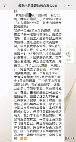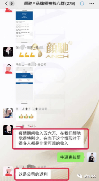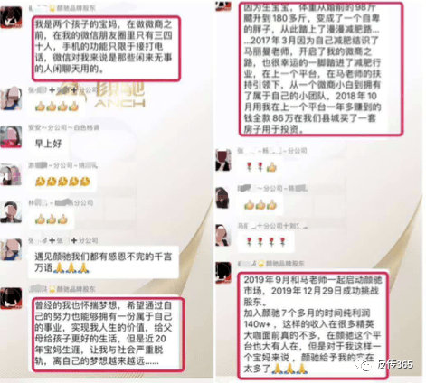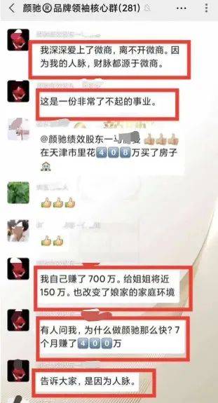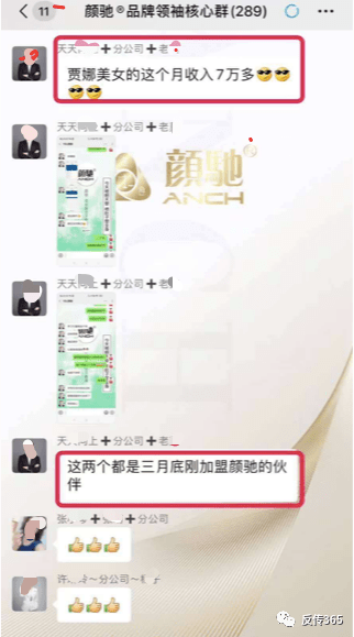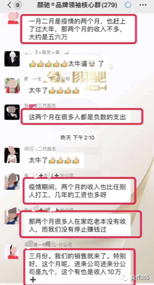 但在随后的“颜驰”品牌核心领袖(多为 股东、分公司级别)的微信群中,笔者却发现聊天中字里行间大量的充斥着月入数万等暴富字眼,讲述加入 “颜驰”微商后生活发生了如何改变,人生发生了如何的逆袭。