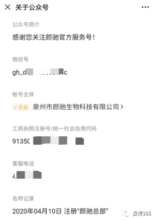 通过公众号搜索到到“颜驰总部”的公众号, “颜驰总部”公众号的账号主体公司为“泉州市颜驰生物科技有限公司”。