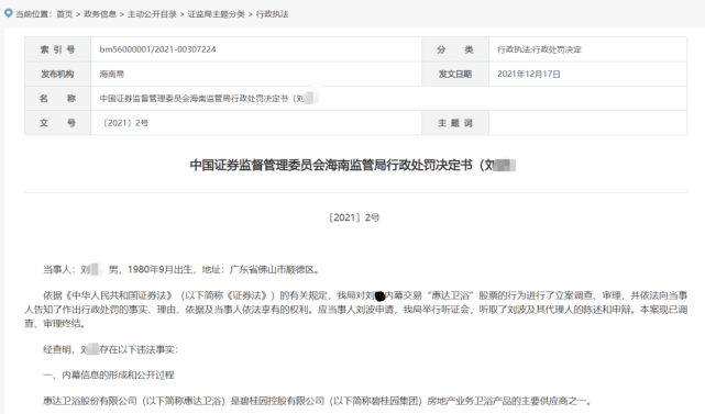 最终,海南证监局判定刘某上述行为构成了内幕交易。依据相关规定,没收刘某内幕交易违法所得407.03万元,并处814.05万元罚款。