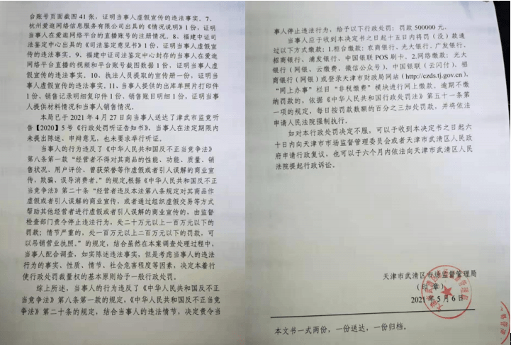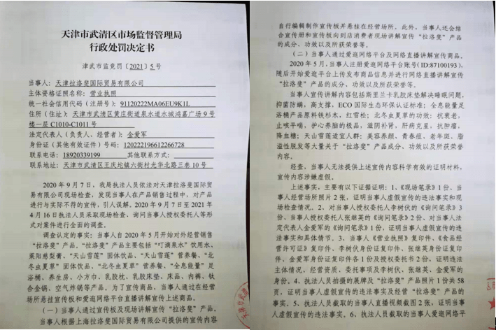值得注意的是,一家名为天津拉洛斐国际贸易有限公司因虚假宣传被罚50万元,据津武市监竞罚〔2021〕5号显示,2020年9月7日,我局执法人员依法对天津拉洛斐国际贸易有限公司现场检查,发现当事人在产品销售过程中,对产品进行与实际不符的宣传,引人误解。2020年9月7日至 2021年4月16日执法人员采取现场检查、询问当事人授权委托人等形式对案件进行全面的调查。