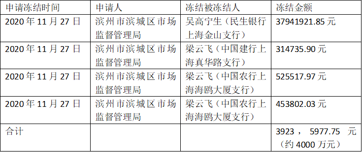 冻结被申请人WUGAONINGSHENG(吴高宁生)在中国民生银行上海金山支行的银行账户存款37941921.85元(账号:62×××57);冻结被申请人梁云飞在中国建设银行上海真华路支行的银行账户存款314735.90元(账号62×××01);冻结被申请人梁云飞在中国农业银行上海海鸥大厦支行的银行账户存款525517.97元(账号:62×××72);冻结被申请人梁云飞在中国农业银行上海海鸥大厦支行的银行账户存款453802.03元,(账号:62×××02)。合计冻结资金近4000万元。