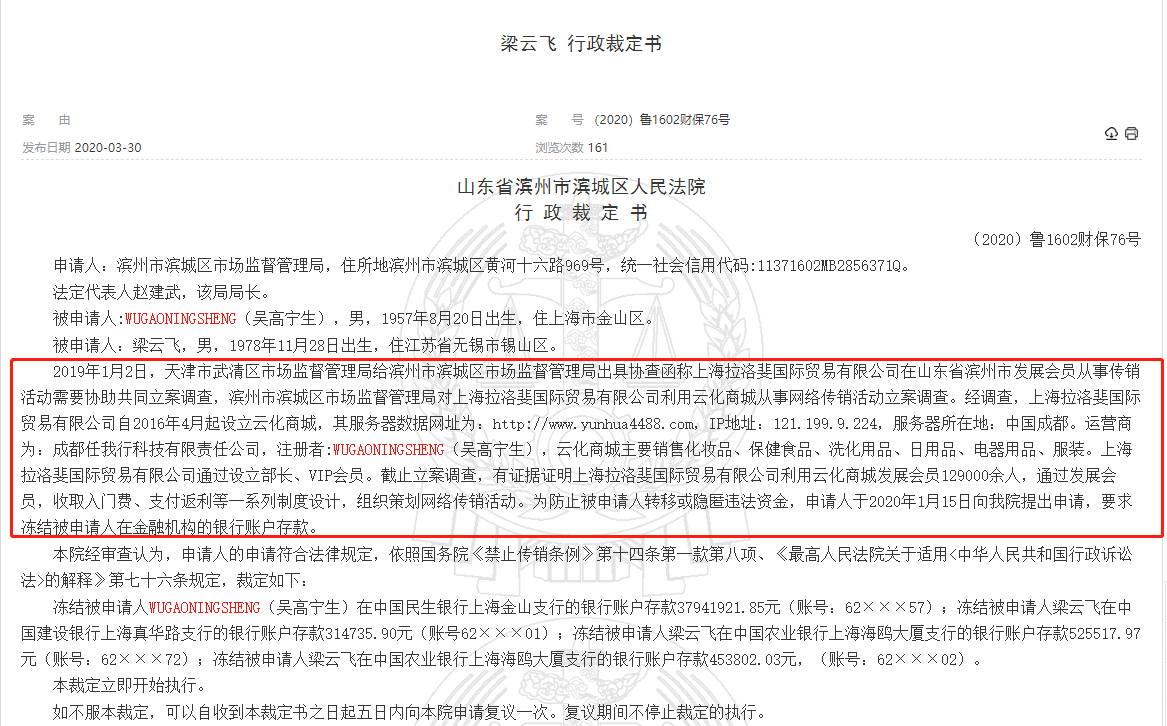此外,2020年3月20日,中国裁判文书网还发布题为《梁云飞 行政裁定书》,据《梁云飞 行政裁定书》显示,2019年1月2日,天津市武清区市场监督管理局给滨州市滨城区市场监督管理局出具协查函称上海拉洛斐国际贸易有限公司在山东省滨州市发展会员从事传销活动需要协助共同立案调查,滨州市滨城区市场监督管理局对上海拉洛斐国际贸易有限公司利用云化商城从事网络传销活动立案调查。