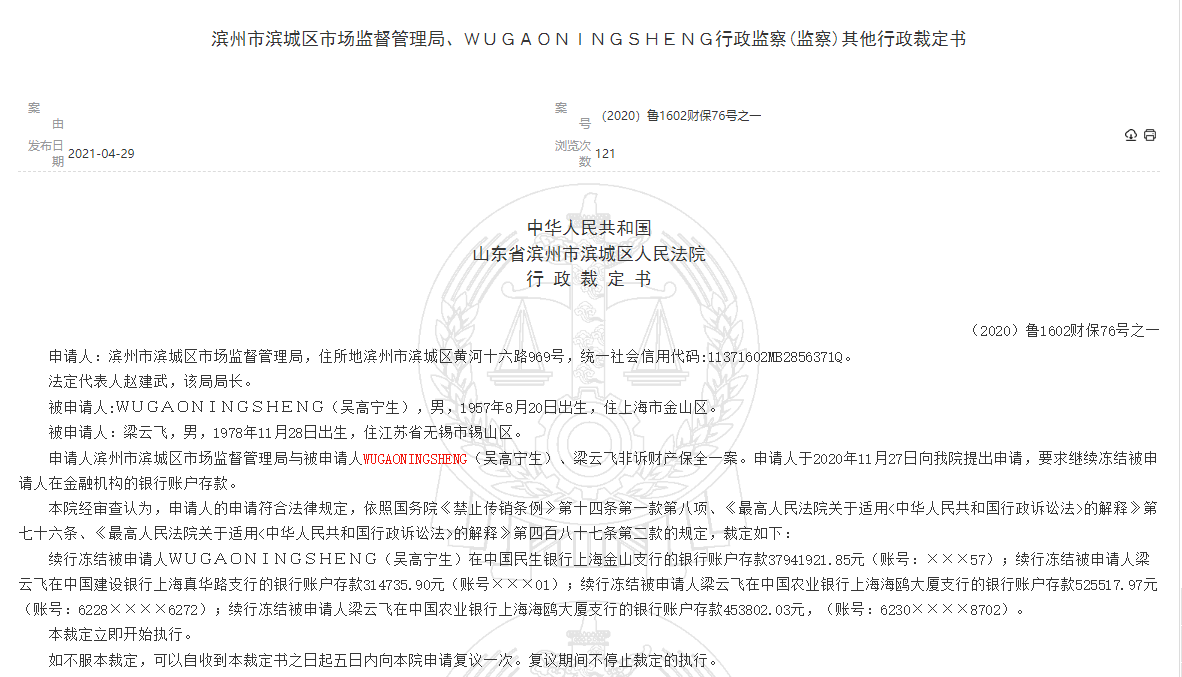 2021年4月29日,中国裁判文书网发布《滨州市滨城区市场监督管理局、WUGAONINGSHENG行政监察(监察)其他行政裁定书》(简称:《行政裁定书》)。