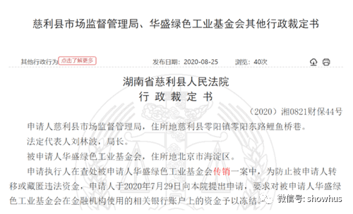 2020年8月25日,法律裁判文书网上公布一则行政裁定书内容。申请执行人湖南省慈利县市场监督管理局在查处被申请人华盛绿色工业基金会传销一案中,为防止被申请人转移或藏匿违法资金,申请人于2020年7月29日向本院提出申请,要求对被申请人华盛绿色工业基金会在金融机构使用的相关银行账户上的资金予以冻结。目前法院认为申请人的申请符合规定,冻结了被申请人华盛绿色工业基金会银行存款9000万元。冻结期限为一年。