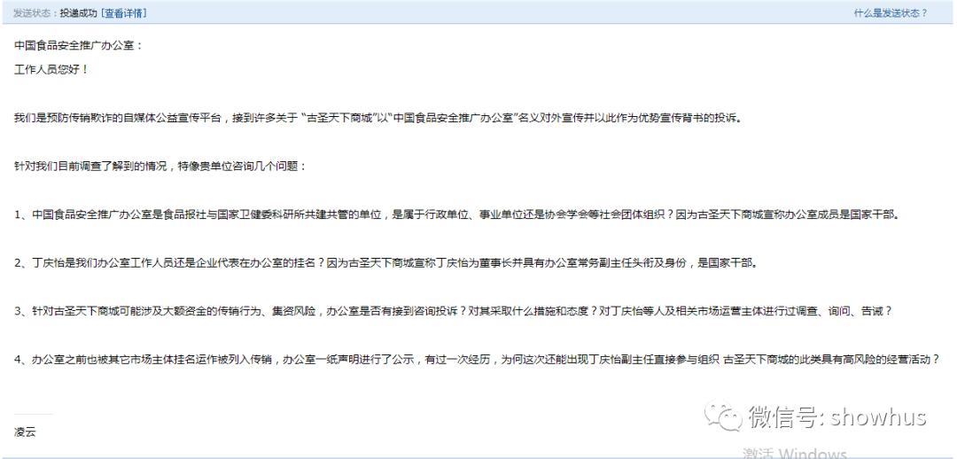 针对古圣天下商城以及丁庆怡的中国安全食品推广办公室常务副主任身份,我们特向中国安全食品推广办公室发送了一封邮件,希望可以得到回复。