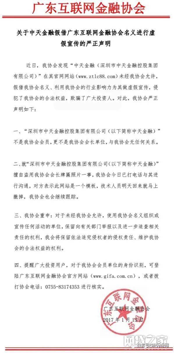 2017年1月13日,广东互联网金融协会发布《关于中天金融假借广东互联网金融协会名义进行虚假宣传的严正声明》公告。指出中天金融在未经允许情况下,假借协会名义,利用协会的行业影响力为其做虚假宣传,侵犯了协会的合法权益,欺骗了广大投资人。该事件源自投资人通过广东互联网金融协会的微信的举报,广东互联网金融协会秘书长朱明春接受采访时表示,“我们工作人员核实之后,发现这家平台极其危险,网站上宣传的给投资者收益为日息3.6%-15%,网站上还标注本息担保,我们发现这个网站诈骗情况非常严重,所以及时发布平台虚假宣传声明,旨在告诫广大投资者,一定要警惕诈骗者。”《关于中天金融假借广东互联网金融协会名义进行虚假宣传的严正声明》。