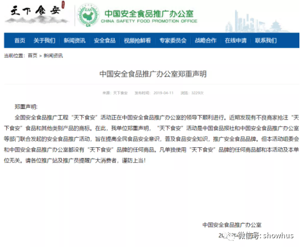 早在2019年4月11日,中国安全食品推广办公室就发布一则郑重声明如下图。