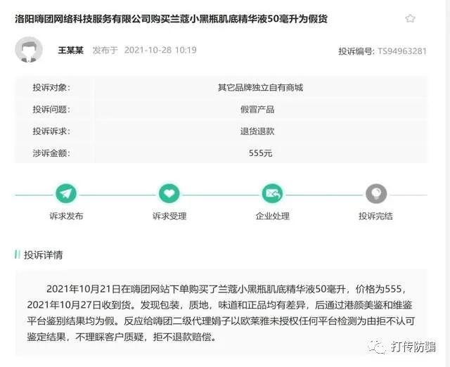 除了涉嫌传销被罚没之后,线上也有不少网友投。2021年10月28日, 王某某在消费保投诉道,2021年10月21日在嗨团网站下单购买了兰蔻小黑瓶肌底精华液50毫升,价格为555,2021年10月27日收到货。发现包装,质地,味道和正品均有差异,后通过港颜美鉴和维鉴平台鉴别结果均为假。反应给嗨团二级代理娟子以欧莱雅未授权任何平台检测为由拒不认可鉴定结果,不理睬客户质疑,拒不退款赔偿。