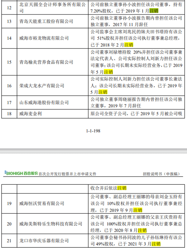 其中荣成大龙水产有限公司长期未实际经营业务,已于2019年5月注销,刘新立为其董事长兼法定代表人;青岛榆炎营养食品有限公司长期未实际经营业务,已于2019年5月注销,刘新立为其董事,且百合股份董事刘禄增持股20%并担任其董事兼法定代表人。