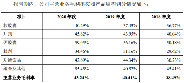 就毛利率来看,报告期内公司主营业务毛利率分别为38.49%、40.41%、43.24%,其中片剂、粉剂、软胶囊、硬胶囊类毛利率逐年增加,组合及其他毛利率先降后增,功能饮品先增后降,部分产品毛利率波动较大,内销毛利率高于外贸业务毛利率。