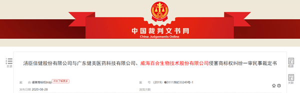 2019年10月,案件号为(2020)粤73民辖终173号的上诉管辖裁定书显示,汤臣倍健公司以健美公司、百合股份未经许可在其生产、销售的膳食营养补充产品上擅自使用与汤臣倍健公司注册商标相同或近似的“健立多”标识,侵害了其注册商标专用权为由,向法院提起诉讼。