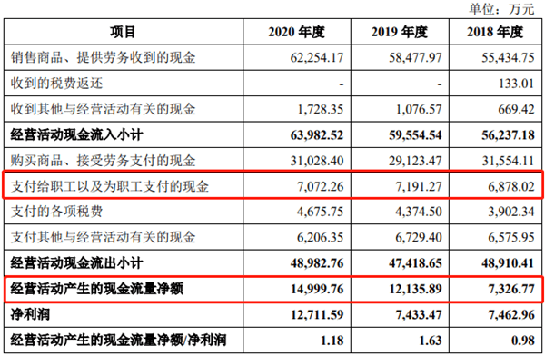 2018年-2020年,经营活动产生的现金流量中支付给职工以及为职工支付的现金分别为6878.02万元、7191.27万元及7072.26万元.截至2020年12月31日,公司应付职工薪酬余额为1,099.72万元,主要为应付职工工资与奖金。