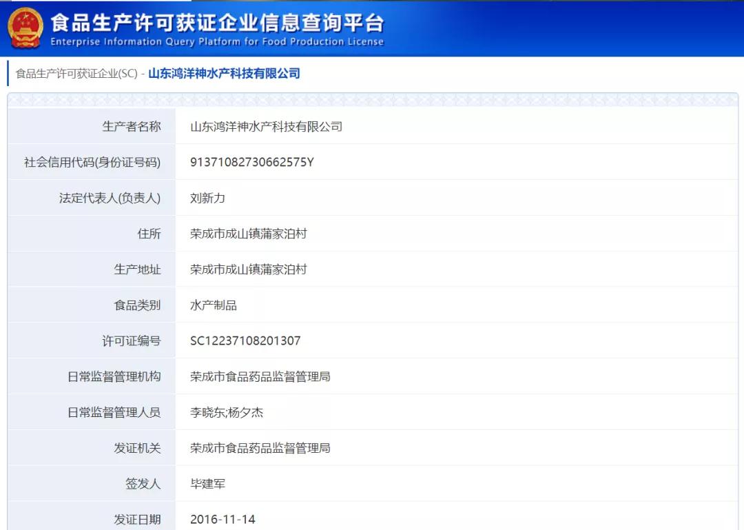 记者通过食品生产许可获证企业信息查询平台进行核验,注意到鸿洋神水产公司食品类别为水产制品,百合股份的则是饮料、糖果制品、特殊膳食食品、保健食品。