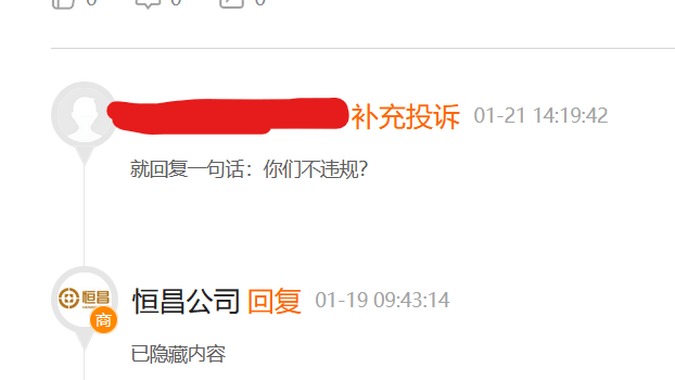 1月21日,该借款人补充投诉,询问恒昌公司是否合规?截至目前,恒昌公司方面未给予回复处理。