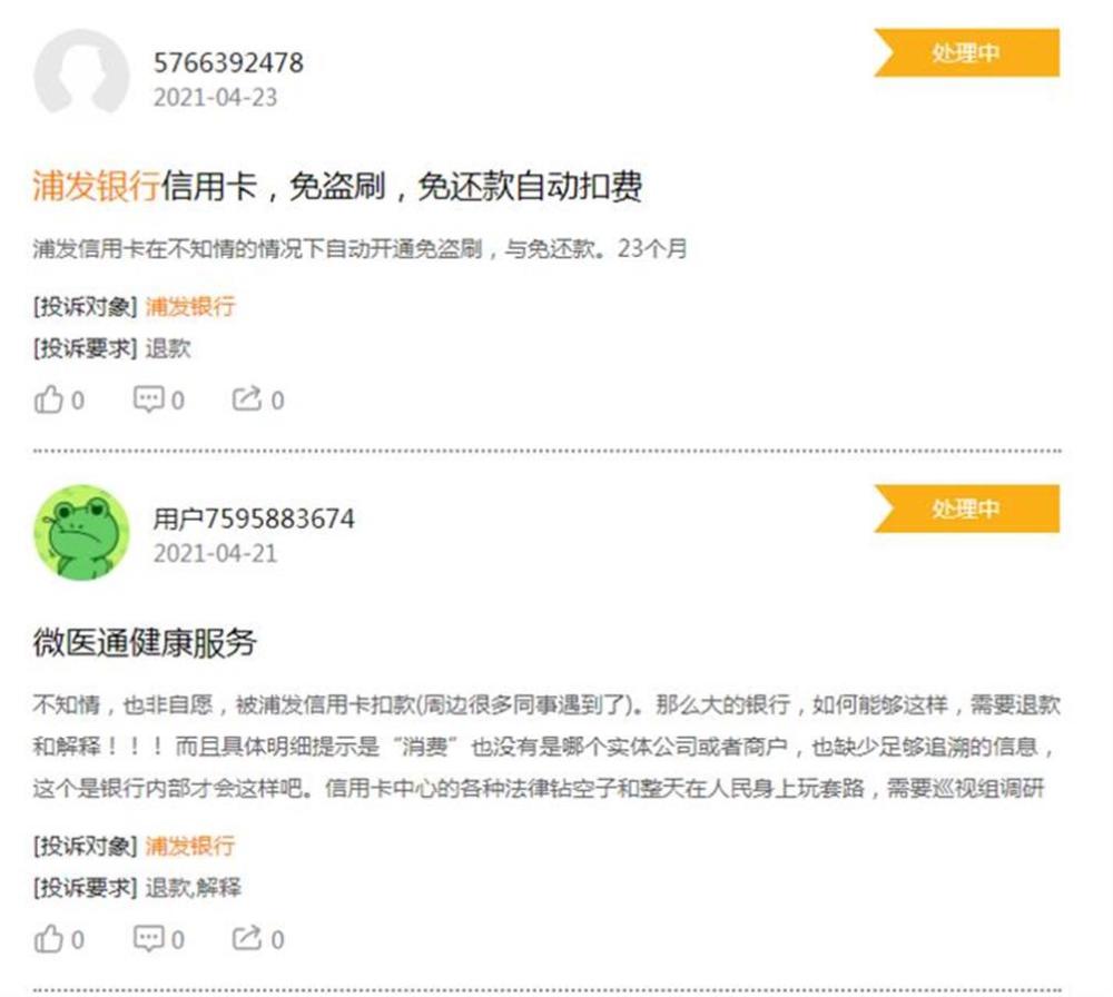 浦发银行信用卡每月私扣费 大量持卡人称未经许可
