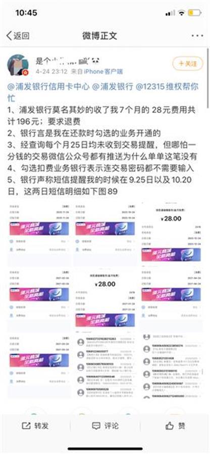 另外一名微博网友反映,浦发银行莫名其妙收了她7个月的费用,每月28元,共196元,银行声称是在她还款时勾选的业务开通。她经过查询发现,每个月25日并未收到交易提醒,她质疑为何没有推送交易提醒,勾选扣费业务为何连交易密码都不用输入。而银行客服声称的9月25日和10月20日曾短信提醒过她,她提供的当日手机短信截图,均显示没有收到提醒。