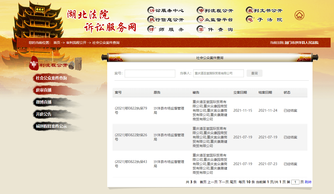 此外,北青网健康还发现,道圣康膜及其关联公司在2021年被湖北省沙洋县市场监督管理局申请执行财产保全。被执行财产保全的企业为重庆道圣堂国际贸易有限公司、重庆众康园商贸有限公司、重庆宜众康商贸有限公司以及重庆康晟健商贸有限公司。该财产保全案在2021年11月24日宣告结案。