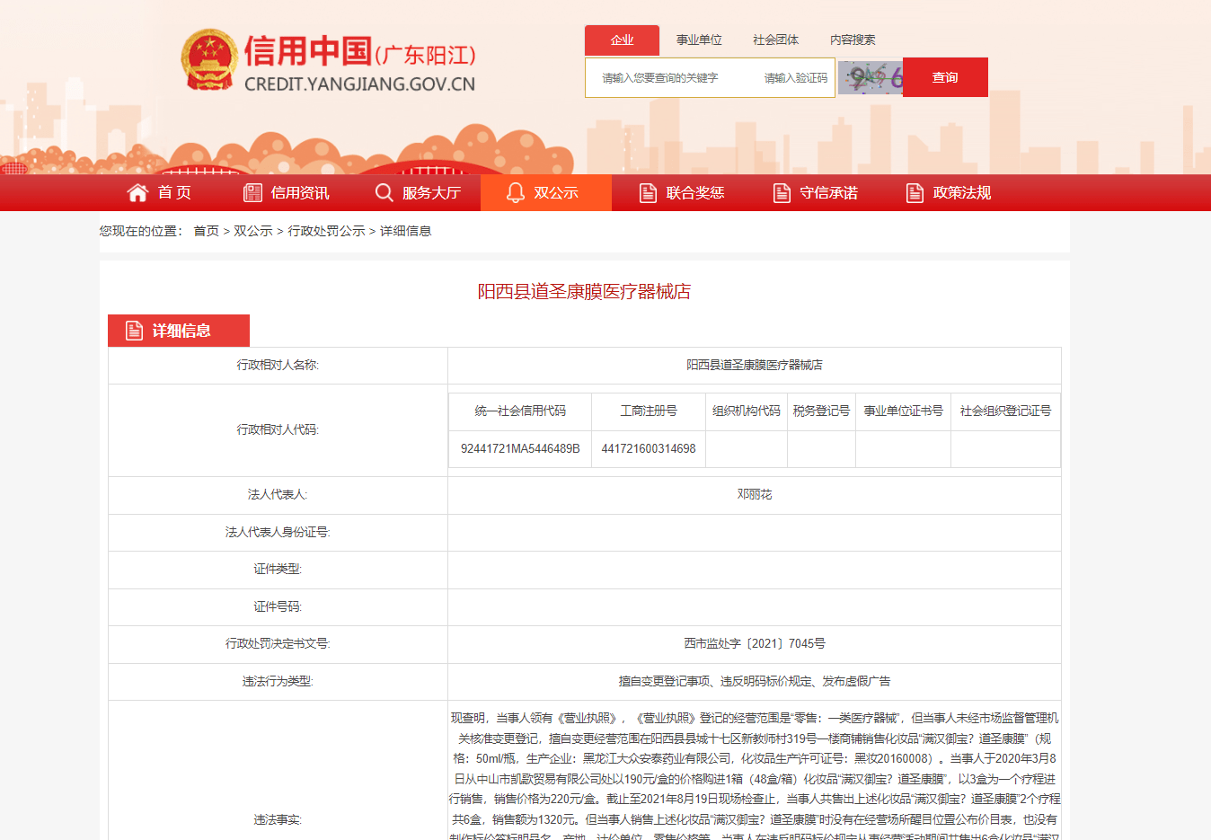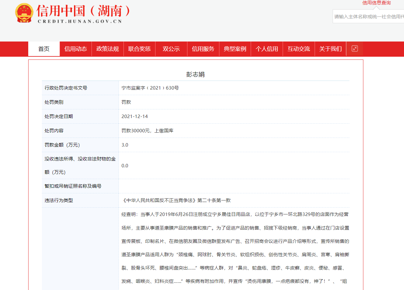 日前,北青网健康在信用中国(湖南)以及信用中国(广东阳江)上发现两则关于道圣康膜的行政处罚信息,其内容为道圣康膜的经销商因虚假宣传、违法广告等行为被监管部门处罚。