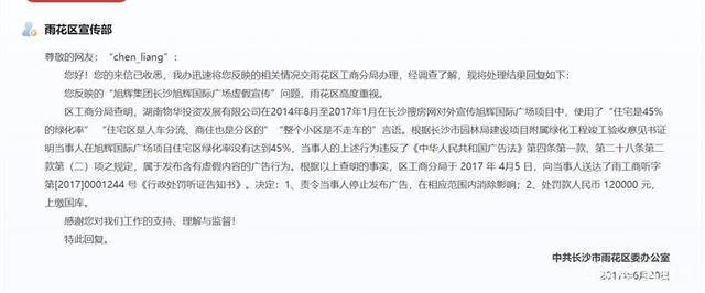 2017年,有业主在“问政湖南”官网投诉旭辉集团长沙旭辉国际广场虚假宣传,彼时雨花区宣传部回复称旭辉在宣传项目时使用了“住宅是45%的绿化率” “住宅区是人车分流、商住也是分区的”“整个小区是不走车的”言语。而根据长沙市园林局建设项目附属绿化工程竣工验收意见书证明当事人在旭辉国际广场项目住宅区绿化率没有达到45%。