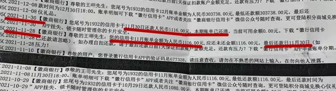 2021年11月,王先生登录徽商银行信用卡APP查询账单,显示11月底需还款1116元,且告知最后还款日为11月30日。之后王先生于11月30 日(也就是最后还款日)还清了1116元的还款金额,同时也收到了缴费账单短信。