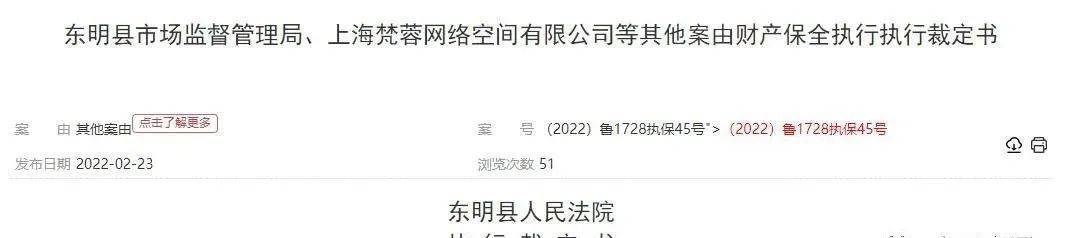 2022 年1月 26日,根据中国裁判文书网公布的《东明县市场监督管理局、上海梵蓉网络空间有限公司等其他案由财产保全执行执行裁定书》,因为上海梵蓉网络空间有限公司、上海上海暴龙创业投资合伙企业(有限合伙)、上海魅婉商贸有限公司、长兴蓉熙供应链管理有限公司、上海楠蓉网络科技有限公司、孙玉婷、缪雨迅、屠雅因涉嫌传销一案,山东省东明县人民法院依法冻结了被申请人银行账户存款2.19亿元,并完成了财产保全执行。