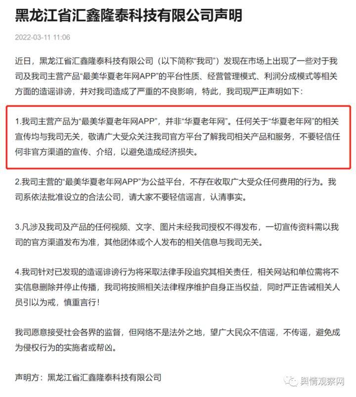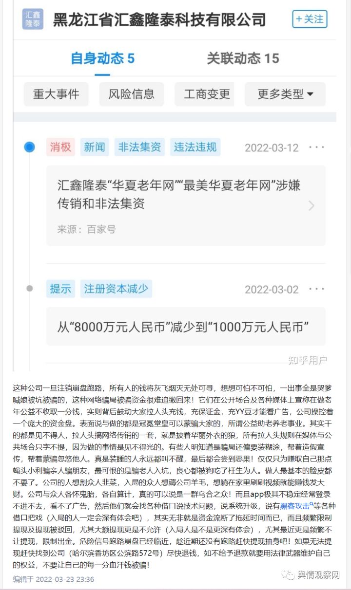 经查,华夏老年网是由黑龙江省汇鑫隆泰科技有限公司运营,据知情人士透露,“为了吸引更多人参与做大资金池,华夏老年网还鼓励老会员拉新,拉一个新会员最低奖励360元。以高额回报刺激,以缴纳入门费为基础,鼓励人传人,涉嫌变种传销。不仅如此,为了应对日益严峻的口碑下滑,黑龙江省汇鑫隆泰科技有限公司发声明否认运营‘华夏老年网’,并推出新名字‘最美华夏老年网’。”