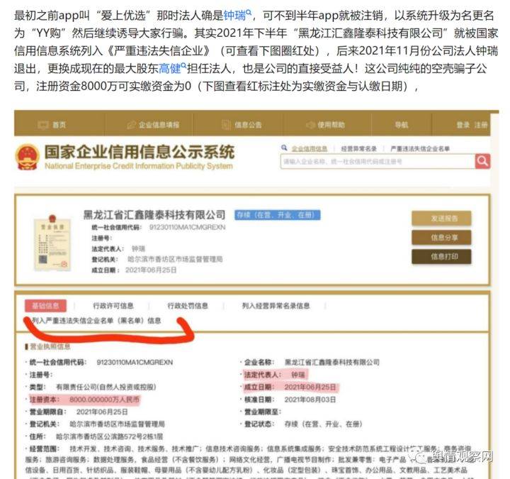 据该知乎网友称:最初之前App叫“爱上优选”那时法人确是钟瑞,可不到半年app就被注销,以系统升级为名更名为“YY购”然后继续诱导大家行骗。其实2021年下半年“黑龙江汇鑫隆泰科技有限公司”就被国家信用信息系统列入《严重违法失信企业》(可查看下图圈红处),后来2021年11月份公司法人钟瑞退出,更换成现在的最大股东高健担任法人,也是公司的直接受益人。