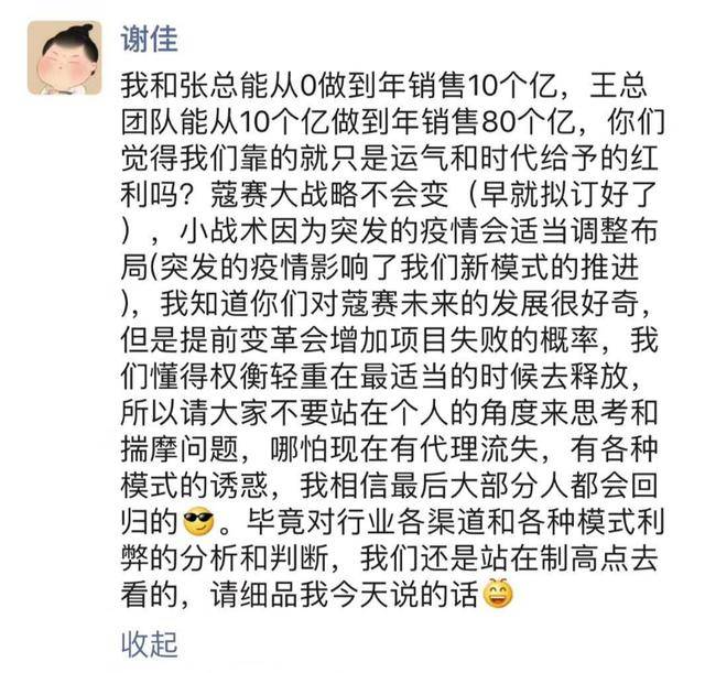 还有知情人告诉记者,近日的群会中,蔻赛微商董事长谢佳还专门提了某自媒体关于蔻赛微商的几篇连载,说她无暇理会,只是呵呵。让知情人失望的是,看到自媒体连载文章曝光以后,董事长谢佳多次发圈,吹嘘自己多么英明能做到年收入10亿,新聘任的王盼王总多么牛掰能做到80亿。借机嘲讽自媒体,自圆其说。
