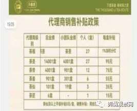 另外拿每套15元销售补贴;推广总业绩30套,小区5套,成为“硒主”,每套100元直推奖(前10000单有)。销售补贴每套30元;推广总业绩200套,小区50套,成为“硒侯”,销售补贴每套50元;推广总业绩1000套,小区300套,成为“硒王”,销售补贴每套75元;推广总业绩5000套,小区1500套,成为“硒皇”,销售补贴每套95元;推广两个硒皇,成为“硒董”,销售补贴95元,另外拿公司1%分红。