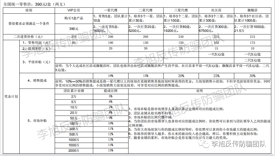 李四表示,该公司利用一件代发,多层级分润层层有层层有奖金,拉人头冲卡位方式,发展下线。只要零售一盒或者拉一个星级代理,上家,上家的上家,上上家,无穷层可以拿奖金。李四卧底在代理群发现,这些所谓的代理商每天跟打了鸡血一样发圈,谁谁谁赚了多少,谁谁谁买车买房了……与诸多被曝光和被处罚的涉传企业营销模式类似。