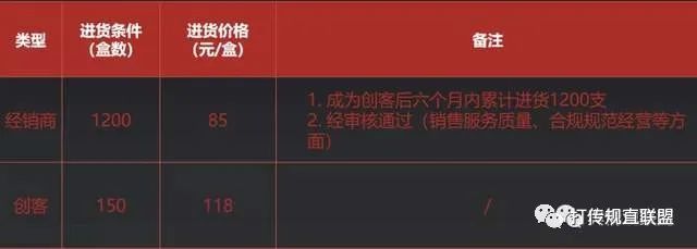 创客:进货150盒,进货价格为118元/盒,总货款为17700元,六个月内累计进货1200盒或伞下有7个创客可晋升为经销商