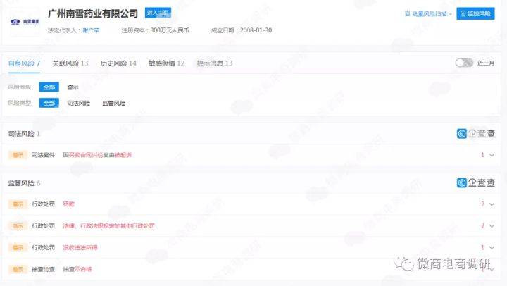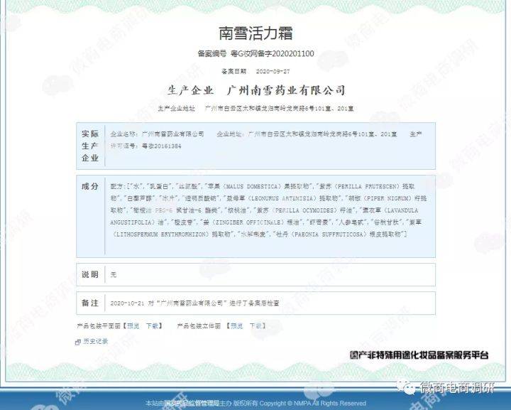 据微商电商调研深入调查,南雪活力霜是中道合美大力推广的产品之一,它的生产企业是广州南雪药业有限公司,该公司成立于2008年01月30日,法定代表人为谢广荣,注册资本为300万元人民币,所属行业为化学原料和化学制品制造业。该公司曾多次被处罚,其中值得注意的是:2020年3月19日广州南雪药业有限公司生产的第二类消毒产品因违反了《消毒管理办法》第三十二条第(二)项的规定而被罚款;2021年8月16日以及2021年12月8日都因为化妆品违法行为被广州市白云区市场监督管理局行政处罚;2019年6月18日因公司使用化妆品禁用原料生产化妆品,被广州市白云区食品药品监督管理局罚款124500元,并没收违法所得;2018年5月16日被广州市白云区市场监督管理局抽查检测不合格被责令整改。