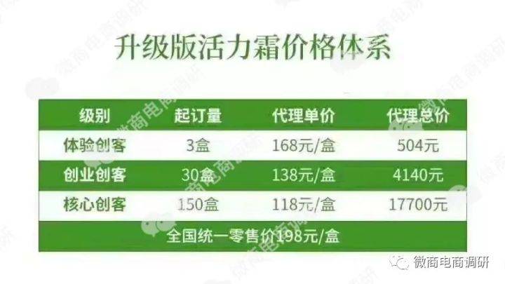 复购、销售奖励:创业创客后续复购30盒活力霜体系产品或复购6盒茶色素,享受每盒10元的补贴,由上一级发放。核心创客后续复购30盒活力霜体系产品或复购6盒茶色素,享受24元每盒的补贴,由上一级发放。除了复购补贴,代理能通过拿货后再零售出去的差价赚取利润,级别越高拿货价就越低赚取的差价就越多。