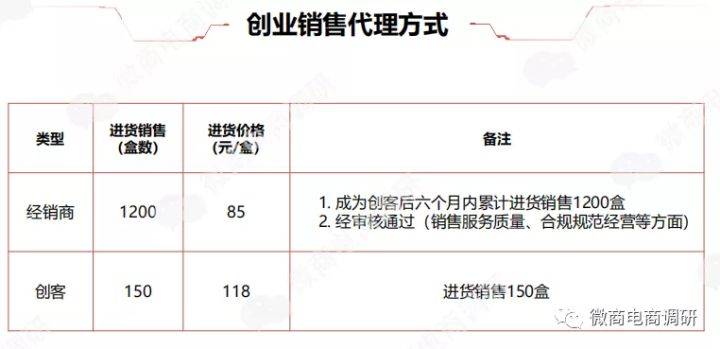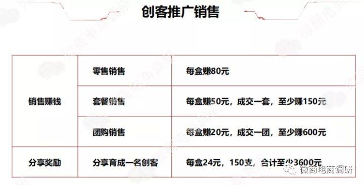 分享奖励:每推广一个核心创客,可以获得3600元的奖励,就是复购150盒享受每盒补贴24元的奖励。并且推广人推荐的代理和这些代理的下线后续销售以及购买的业绩,都会计入推广人的团队业绩,当推广人团队业绩累积达到1200盒后,该代理升级为经销商。