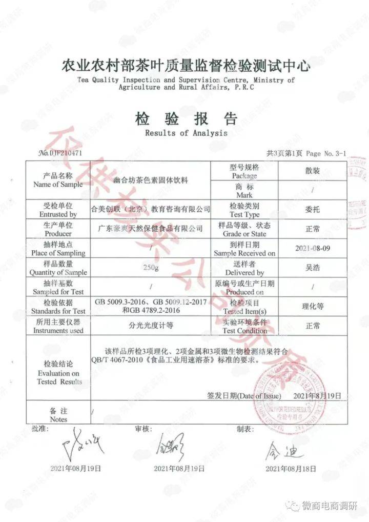 其主要宣传的产品之二茶色素,全名幽合坊茶色素固体饮料。茶色素是茶的主要生物活性成分之一,是茶叶中儿茶素及其衍生物氧化而成的,茶色素也是复合体,一般学术界认为茶色素由茶黄素,茶红素,茶褐素组成其中茶褐素最为稳定,分子量也最大。就茶色素本身确实有调节血压血脂等功效,经过特殊处理变成药品后才有治疗功效,目前市面上提炼复方茶色素纯度最高的只有黄精茶色素、玉竹茶色素、力邦茶色素这三种,而且全国能够研制出来的企业寥寥无几。但是,微商电商调研人员在官方平台特殊食品里根本检索不到中道合美销售这款幽合坊茶色素固体饮料,所以中道合美大肆宣传的治疗各种疾病的茶色素,并不属于药品也不是保健食品,只是一款普通的固体饮料。对于中道合美宣传该产品有各种神奇的治疗效果明显是虚假宣传。